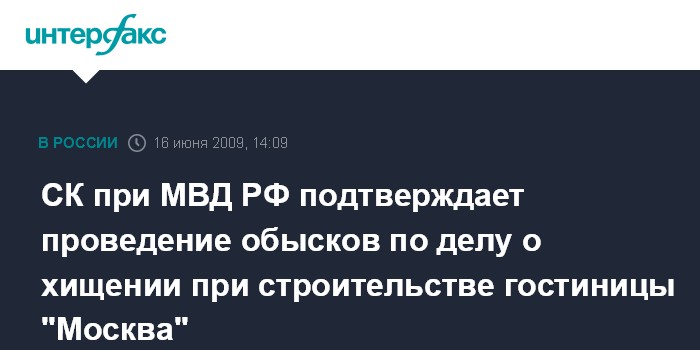 СК при МВД РФ подтверждает проведение обысков по делу о хищении при строительстве гостиницы "Москва"
