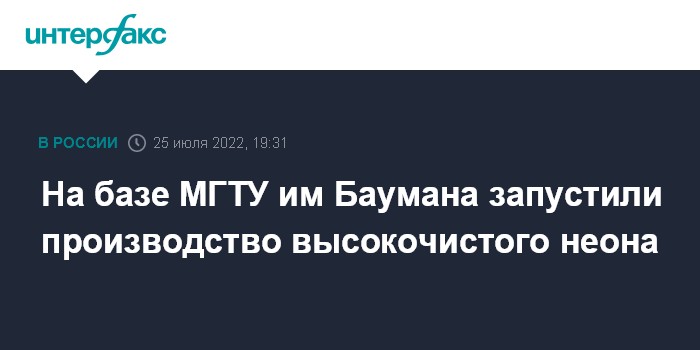 Москва. 25 июля. INTERFAX.RU - Новое производство высокочистого неона, используемого в производстве микроэлектроники для смартфонов, автомобилей и другой техники, запущено в России на базе МГТУ им Н.Э. Баумана.
