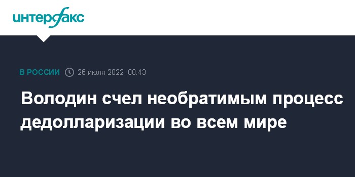 Москва. 26 июля. INTERFAX.RU - Председатель Госдумы Вячеслав Володин считает необратимым процесс дедолларизации во всем мире.
