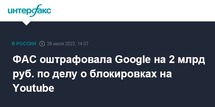 Москва. 26 июля. INTERFAX.RU - Федеральная антимонопольная служба (ФАС) РФ оштрафовала Google LLC на 2 млрд рублей ($34,89 млн) за злоупотребление доминирующим положением на рынке сервисов видеохостинга YouTube, сообщила пресс-служба ведомства.