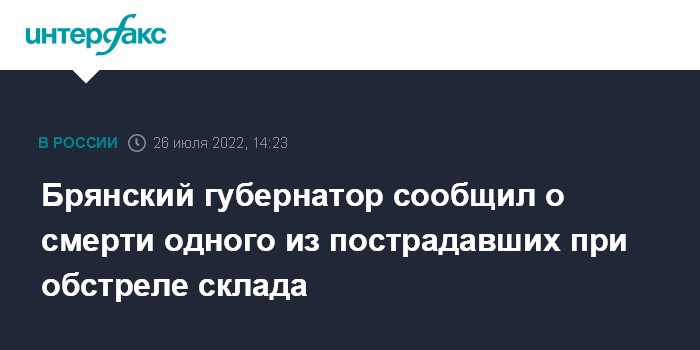 Москва. 26 июля. INTERFAX.RU - Губернатор Брянской области Александр Богомаз сообщил в Telegram, что умер один из пострадавших в результате обстрела МАПП "Троебортное".