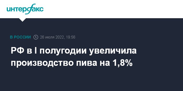 Москва. 26 июля. INTERFAX.RU - Пивоваренные компании РФ в первом полугодии 2022 года произвели 352,6 млн декалитров (дал) пива, что на 1,8% больше, чем за аналогичный период прошлого года, сообщает Национальная ассоциация защиты прав потребителей.