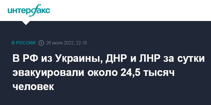 Москва. 26 июля. INTERFAX.RU - В течение минувших суток на территорию России из Донецкой и Луганской республик, украинских населённых пунктов вывезены почти 24,5 тысяч человек, сообщил начальник Национального центра управления обороной РФ Михаил Мизинцев на брифинге во вторник.