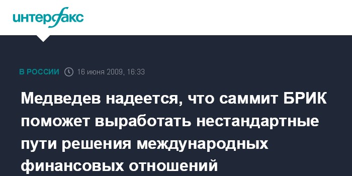 Москва. 16 июня. INTERFAX.RU - Президент РФ Дмитрий Медведев считает, что сегодня назрела необходимость для встречи на высшем уровне стран - членов объединения БРИК. Выступая во вторник на открытии саммита в узком составе, Медведев отметил, что "сегодня непростое положение в мировой экономике и международной финансовой системе". "По всей вероятности, такого рода координация позволит выработать нестандартные пути решения международных финансовых отношений", - сказал глава государства.