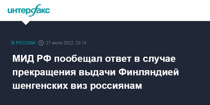 Москва. 27 июля. INTERFAX.RU - В МИД РФ назвали откровенно дискриминационной политической мерой возможную реализацию прекращения выдачи Финляндией шенгенских туристических виз гражданам России, в случае осуществления этих планов Москва оставляет за собой право принять ответные меры.