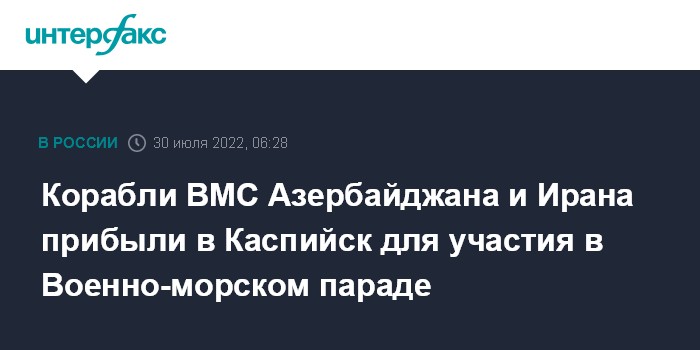 Москва. 30 июля. INTERFAX.RU - Корабли Военно-морских сил (ВМС) Азербайджана и Ирана прибыли в Каспийск для участия в параде, посвященном Дню Военно-Морского Флота (ВМФ) России, сообщает в субботу пресс-служба Южного военного округа.