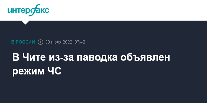 Москва. 30 июля. INTERFAX.RU - В Чите введен режим чрезвычайной ситуации (ЧС) из-за паводка, река Чита разлилась после дождей и затопила ряд городских улиц и дачных поселков, сообщает в социальных сетях администрация города.