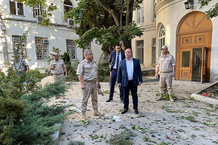 Губернатор Севастополя Михаил Развожаев (в центре) у штаба Черноморского флота РФ, который был атакован украинской стороной
