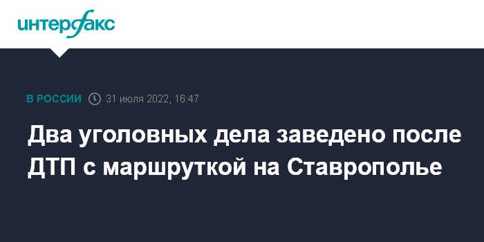 Москва. 31 июля. INTERFAX.RU - Обстоятельства гибели шести человек в аварии с участием маршрутного микроавтобуса в районе Светлограда в Ставропольском крае будут расследовать в рамках двух уголовных дел.