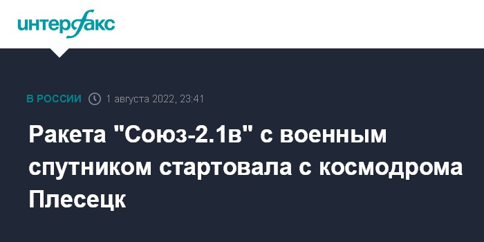 "В понедельник, 1 августа, в 23 часа 25 минут по Москве с Государственного испытательного космодрома Министерства обороны Российской Федерации (космодром Плесецк) боевым расчетом Космических войск Воздушно-космических сил успешно осуществлен запуск ракеты-носителя легкого класса "Союз-2.1в" с космическим аппаратом (КА), разработанным в интересах Минобороны России", - говорится в сообщении.