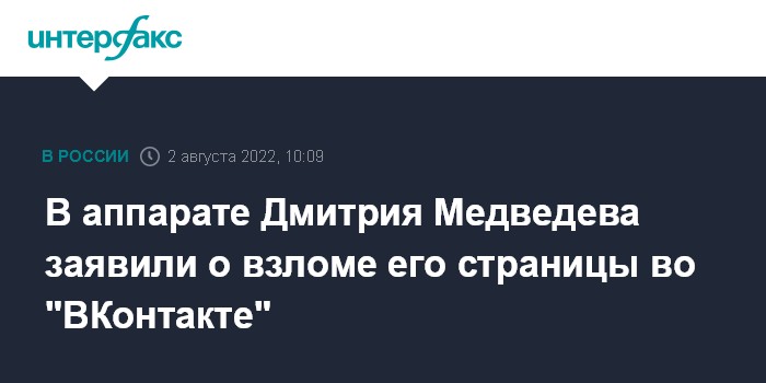 Москва. 2 августа. INTERFAX.RU - В ночь на 2 августа была взломана страница зампредседателя Совета безопасности России Дмитрия Медведева в соцсети "ВКонтакте", сообщили в аппарате Медведева.