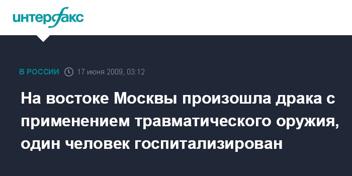 Москва. 17 июня. ИНТЕРФАКС-МОСКВА - Драка с применением травматического оружия произошла в восточном округе столицы в среду ночью, сообщил "Интерфаксу" дежурный офицер управления информацией и общественных связей ГУВД Москвы Игорь Башев.