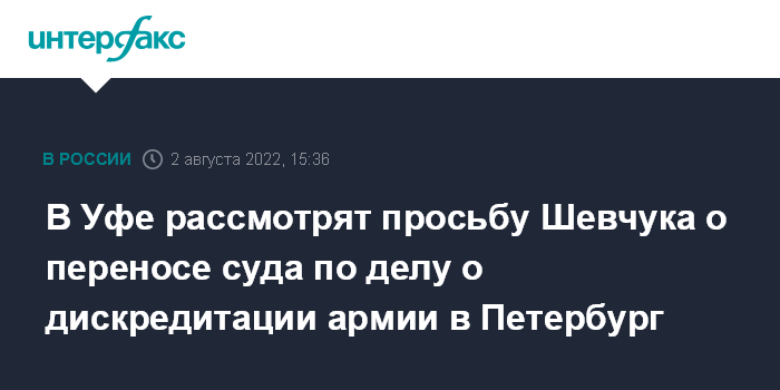 По письменному ходатайству Шевчука материалы направили на рассмотрение в петербургский суд. 30 мая Дзержинский районный суд северной столицы вернул протокол полиции в связи с тем, что в нем "не было описано событие правонарушения" и отсутствовало "указание на то, в чем именно выразились публичные призывы к воспрепятствованию использования Вооруженных сил РФ в целях защиты интересов РФ и ее граждан". 15 июля материалы снова поступили в Дзержинский суд, а 18 июля дело было отправлено по подведомственности в Советский районный суд Уфы, где на 5 августа назначено заседание по его рассмотрению.