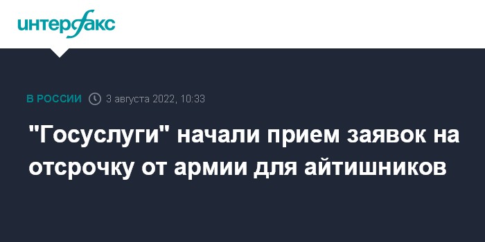 Москва. 3 августа. INTERFAX.RU - На портале госуслуг начали принимать заявки на отсрочку от армии для IT-специалистов в рамках осеннего призыва, сообщиал пресс-служба Минцифры.
