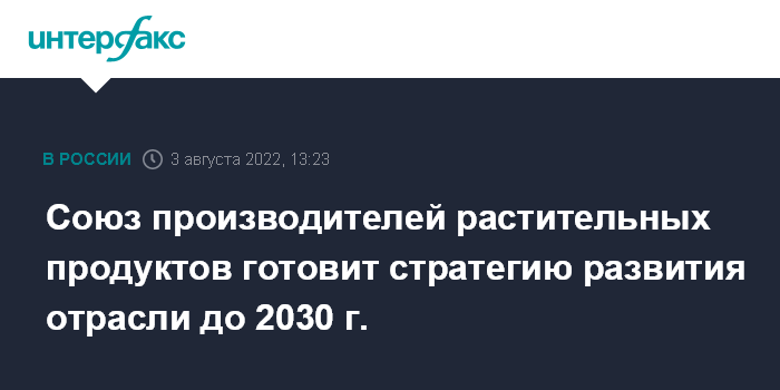 Москва. 3 августа. INTERFAX.RU - Российский Союз производителей продукции на растительной основе готовит стратегию развития отрасли на период до 2030 года.