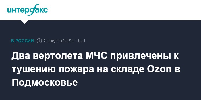 Москва. 3 августа. INTERFAX.RU - Тушение пожара на складе Ozon в подмосковной Истре осложняется конструктивными особенностями здания и жаркой погодой, к ликвидации возгорания привлечена авиация МЧС, сообщили в министерстве.