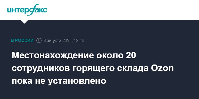 Москва. 3 августа. INTERFAX.RU - Два десятка сотрудников горящего в Подмосковье склада Ozon отсутствуют в списках эвакуированных, сообщили "Интерфаксу" в экстренных службах.