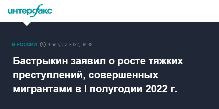 Москва. 4 августа. INTERFAX.RU - В Следственном комитете России фиксируют увеличение количества тяжких и экстремистских преступлений, совершенное мигрантами в первой половине 2022 года.