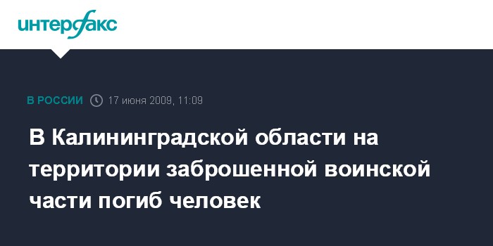 Москва. 17 июня. INTERFAX.RU - В Калининградской области в районе города Пионерский на территории заброшенной воинской части погиб человек, сообщили "Интерфаксу" в региональном УВД. Как рассказал собеседник агентства, на территории заброшенной воинской части, расположенной на берегу Балтийского моря, стоит высокая смотровая вышка. Именно под этим сооружением был обнаружен труп жителя Калининграда 1986 г.р. со множественными ушибами и переломами.