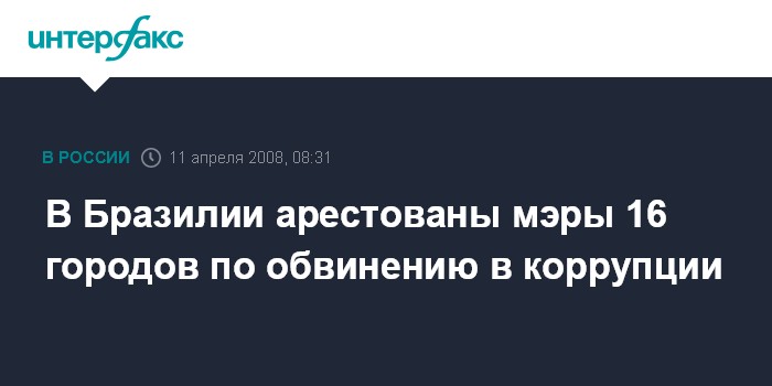 Лондон. 11 апреля. INTERFAX.RU - Полиция Бразилии арестовала по обвинению в коррупции мэров сразу 16-ти городов и одного федерального судью, сообщила британская телерадиовещательная корпорация BBC в пятницу.