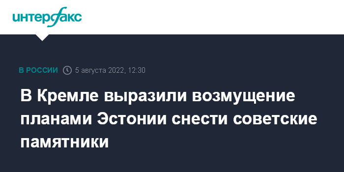 "Мы, конечно, считаем это возмутительным - война с историей, причем с общей историей, избавление от памятников тем, кто спас Европу от фашизма. Это, конечно, возмутительно, это не красит никакую нацию, в том числе не красит Эстонию", - сказал Песков журналистам в пятницу.