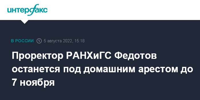 "Постановлением Тверского районного суда города Москвы от 5 августа 2022 года обвиняемому Федотову Ивану Владимировичу в совершении преступления, предусмотренного ч. 4 ст. 159 УК РФ, продлен срок содержания под домашним арестом до 7 ноября 2022 года", - сказали в пресс-службе.