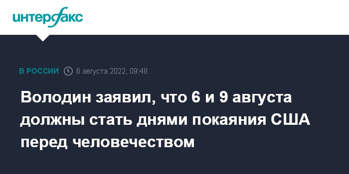 "6 и 9 августа должны стать днями покаяния Вашингтона перед человечеством за преступления, совершенные в отношении мирных граждан", - написал Володин в субботу в своем телеграмм-канале.