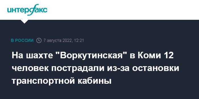 Москва. 7 августа. INTERFAX.RU - Экстренная остановка клети (транспортной кабины) произошла на шахте "Воркутинская" в воскресенье утром, пострадали 12 человек, сообщает пресс-служба АО "Воркутауголь" на своей странице ВКонтакте.