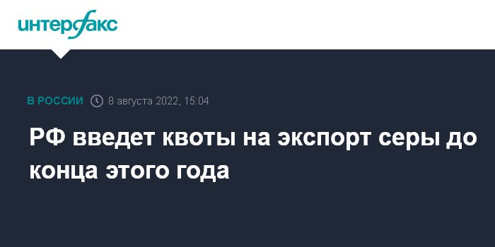 Москва. 8 августа. INTERFAX.RU - Россия вводит квоты на экспорт серы – одного из видов сырья для производства минеральных удобрений – на период с 10 августа по 31 декабря 2022 года в объеме 1,1 млн тонн.