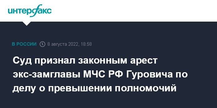 Москва. 8 августа. INTERFAX.RU - Мосгорсуд оставил без изменения решение об аресте бывшего заместителя главы МЧС Андрея Гуровича в рамках уголовного дела о превышении должностных полномочий, сообщили "Интерфаксу" в суде.