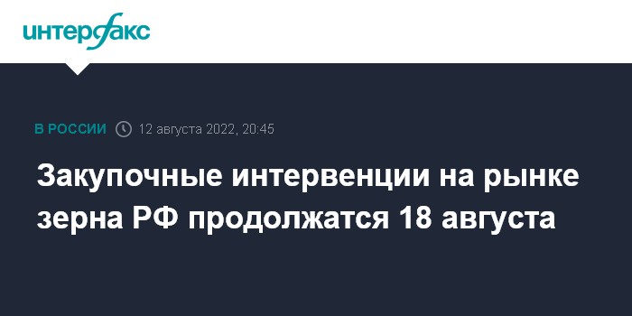 Москва. 12 августа. INTERFAX.RU - Закупки зерна в государственный интервенционный фонд РФ продолжатся 18 августа, сообщается в материалах Национальной товарной биржи (НТБ, входит в группу "Московская биржа").