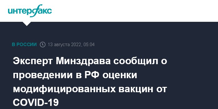 Москва. 13 августа. INTERFAX.RU - В России проводится оценка эффективности вакцин, модифицированных под новые штаммы и варианты коронавируса; Минздрав РФ прорабатывает регуляторные механизмы для выведения на рынок модификаций вакцин от новых штаммов COVID-19, сообщил замгендиректора по экспертизе лекарственных средств Научного центра экспертизы средств медицинского применения Минздрава России Вадим Меркулов.
