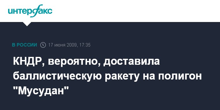 Сеул. 17 июня. INTERFAX.RU - На северокорейский полигон "Мусудан", вероятно, доставлена ракета большой дальности, сообщила в среду южнокорейская газета "Чосон Ильбо" со ссылкой на источник в правительстве Южной Кореи.