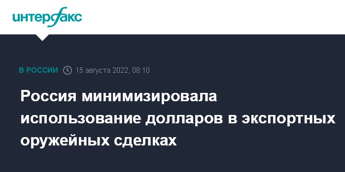 Москва. 15 августа. INTERFAX.RU - Россия минимизировала расчеты в долларах США при реализации экспортных оружейных контрактов, заявил в интервью "Интерфаксу" вице-премьер - глава Минпромторга РФ Денис Мантуров.