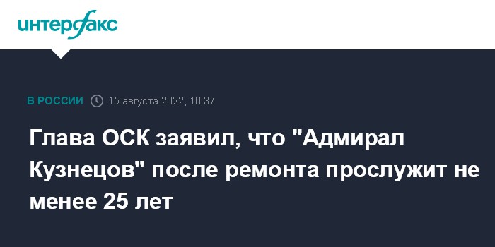 Глава ОСК: после ремонта авианосец "Адмирал Кузнецов" прослужит не менее 25 летЧитать подробнее"По кораблю приняты решения, которые я не могу комментировать, но отмечу, что после ремонта авианосец "Адмирал Кузнецов" прослужит не менее 25 лет", - сказал он в интервью в связи с открывающимся в понедельник военно-техническим форумом "Армия-2022".