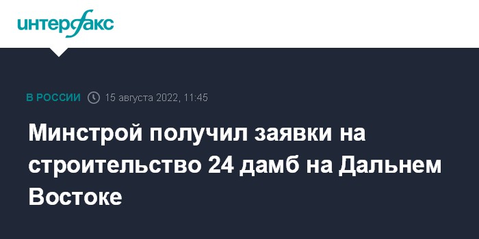 Москва. 15 августа. INTERFAX.RU - Минстрой получил заявки на строительство еще 24 дамб для защиты от паводков в дальневосточных регионах в 2025-2027 годах, сообщил на совещании по предотвращению ЧС и ликвидации их последствий глава Минприроды Александр Козлов.