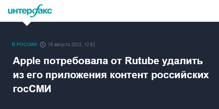 Москва. 15 августа. INTERFAX.RU - Компания Apple потребовала от Rutube в течение двух недель удалить из своего приложения для операционной системы iOS контент государственных СМИ РФ; видеохостинг не будет этого делать, сообщили "Интерфаксу" в пресс-службе сервиса.