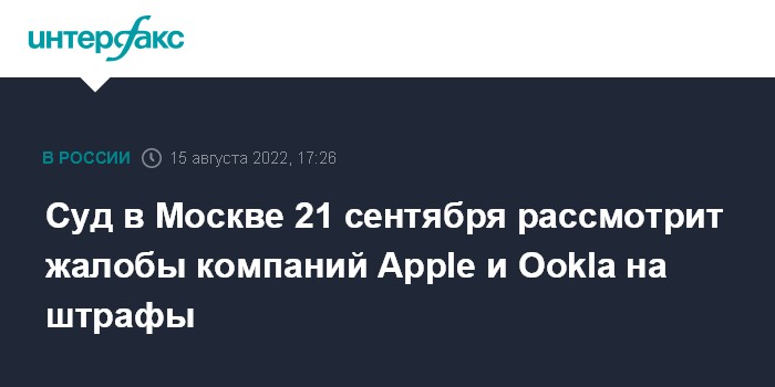 Суд в Москве 21 сентября рассмотрит жалобы компаний Apple и Ookla на штрафы