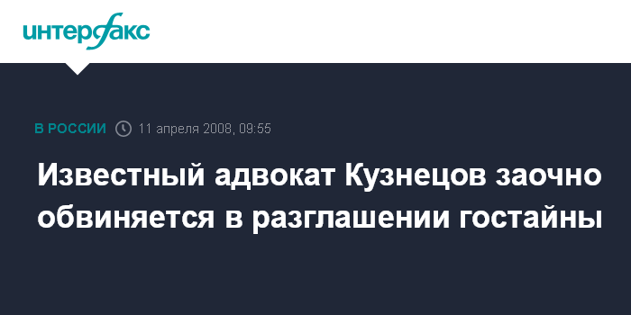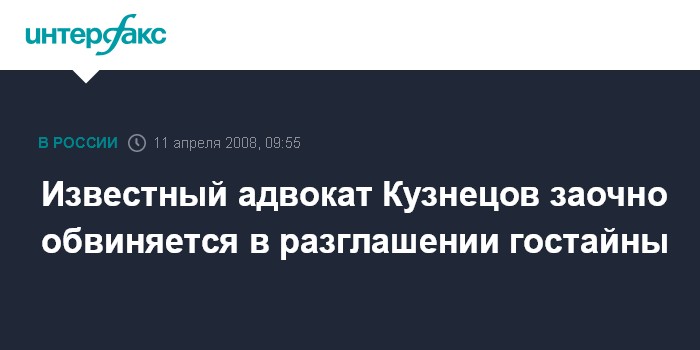 Москва. 11 апреля. INTERFAX.RU - Следственное управление СКП РФ по Москве предъявило известному российскому адвокату Борису Кузнецову заочное обвинение в разглашении гостайны (ст. 283 УК РФ).