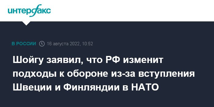 Москва. 16 августа. INTERFAX.RU - Россия пересматривает подходы к обороне своей территории из-за изменения условий безопасности в Балтийском регионе и Арктике после вступления Швеции и Финляндии в НАТО, заявил министр обороны РФ Сергей Шойгу.