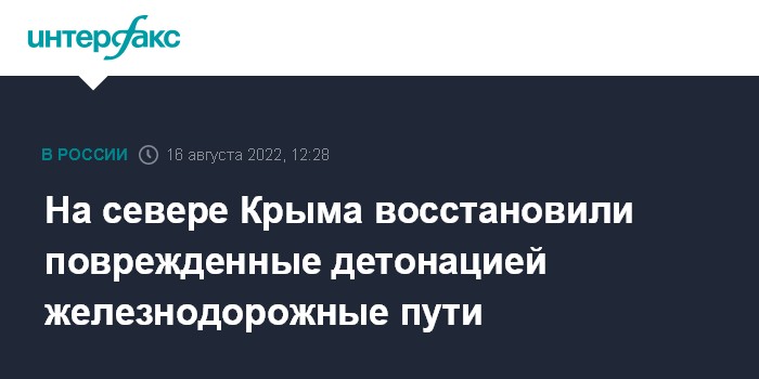 Москва. 16 августа. INTERFAX.RU - Железнодорожные пути, поврежденные в результате детонации боеприпасов в воинской части в Джанкойском районе на севере Крыма, восстановлены, сообщил глава республики Сергей Аксенов.