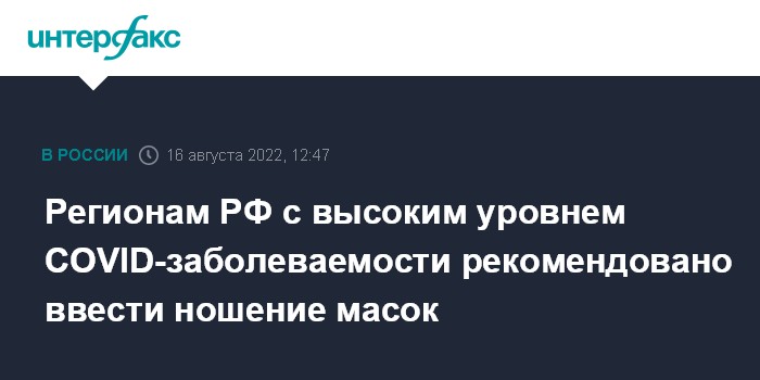 Москва. 16 августа. INTERFAX.RU - Роспотребнадзор направил в регионы, где уровень заболеваемости COVID-19 превышает 50 случаев на 100 тысяч человек, письмо с рекомендациями о целесообразности ношения масок в общественных местах, на транспорте и в местах работы и учебы, сообщили в пресс-службе ведомства во вторник.