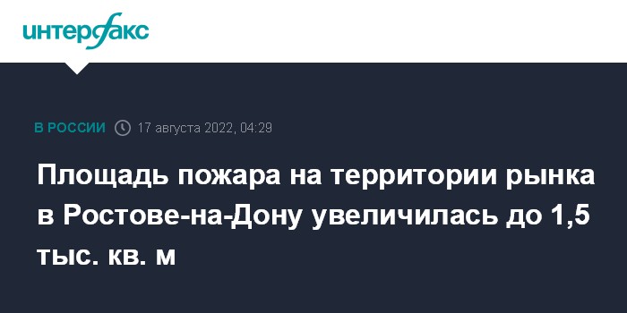 Москва. 17 августа. INTERFAX.RU - В пресс-службе ГУ МЧС России по Ростовской области уточнили, что возгорание поддонов с прессованной бумагой произошло на территории рынка в Ростове-на-Дону, площадь пожара увеличилась с 600 до 1,5 тыс. кв.м.