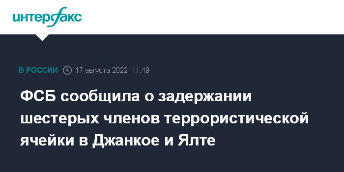 Москва. 17 августа. INTERFAX.RU - Шесть членов ячейки запрещенной в РФ террористической организации "Хизб ут-Тахрир аль-Ислами" задержаны в городах Джанкой и Ялта, сообщил в среду Центр общественных связей (ЦОС) ФСБ.