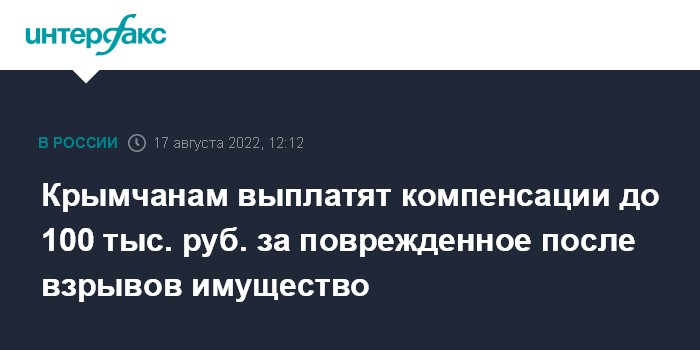 Москва. 17 августа. INTERFAX.RU - Жителям сел в Джанкойском районе на севере Крыма планируется выплатить компенсации в размере 10, 50, 100 тыс. рублей за имущество, поврежденное и утерянное в результате разрывов боеприпасов на военном складе, сообщил глава республики Сергей Аксенов журналистом в среду.