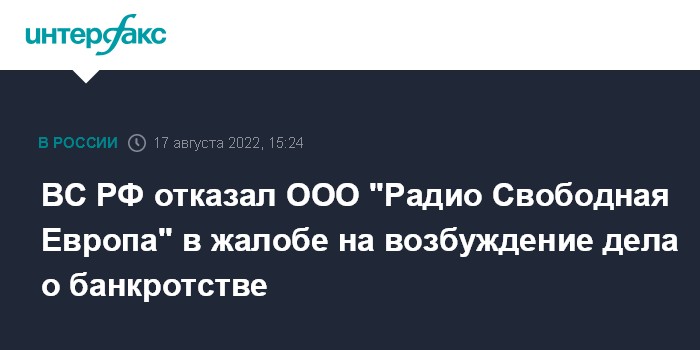 Москва. 17 августа. INTERFAX.RU - Верховный суд РФ отказал ООО "Радио Свободная Европа" (РСЕ/РС, признано в РФ СМИ-иноагентом) в пересмотре вопроса о возбуждении по заявлению инспекции Федеральной налоговой службы (ИФНС) №7 по Москве дела о банкротстве компании, говорится в информации на сайте суда.