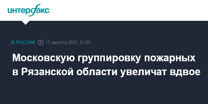 Москва. 17 августа. INTERFAX.RU - Группировка московских пожарных и техники, которая помогает тушить природные пожары в Рязанской области, будет увеличена в два раза по поручению мэра столицы Сергея Собянина, сообщил его заместитель Петр Бирюков.