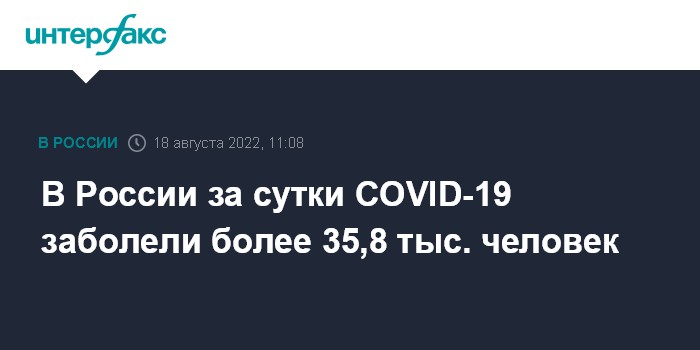 Москва. 18 августа. INTERFAX.RU - Суточный прирост новых заболевших коронавирусной инфекцией в РФ впервые с середины марта превысил 35,8 тысячи случаев, госпитализированы более 3,2 тысячи человек, скончались 62 пациента с COVID-19, следует из данных оперативного штаба, обнародованных в четверг.