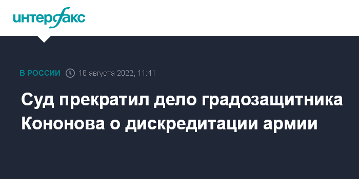 Москва. 18 августа. INTERFAX.RU - Санкт-Петербургский городской суд отменил решение Ленинского районного суда, который в мае оштрафовал градозащитника Александра Кононова за дискредитацию российской армии (ст.20.3.3 КоАП) , сообщила объединенная пресс-служба городских судов.
