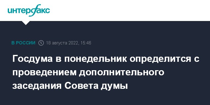 Москва. 18 августа. INTERFAX.RU - Госдума в понедельник решит вопрос о необходимости проведения дополнительного заседания совета нижней палаты парламента, сообщил председатель Госдумы Вячеслав Володин.